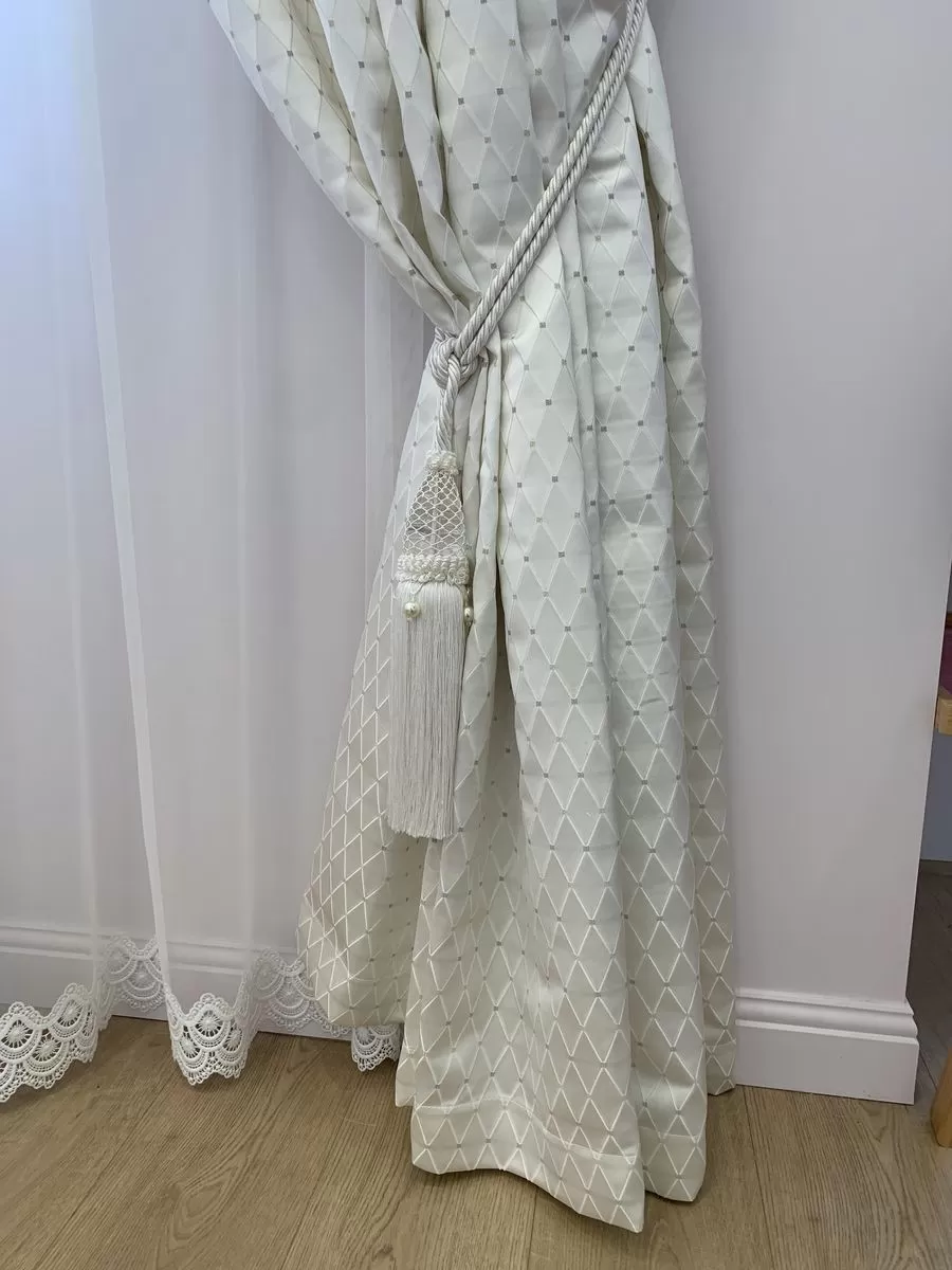 Легкий и светлый комплект штор, созданный специально для оформления детской комнаты. Белые портьеры с деликатным рисунком, дополненные тюлем с декоративным купоном и изящными подхватами-кистями, формируют нежное, сбалансированное решение, в котором сочетаются уют, стиль и забота о комфорте ребенка.