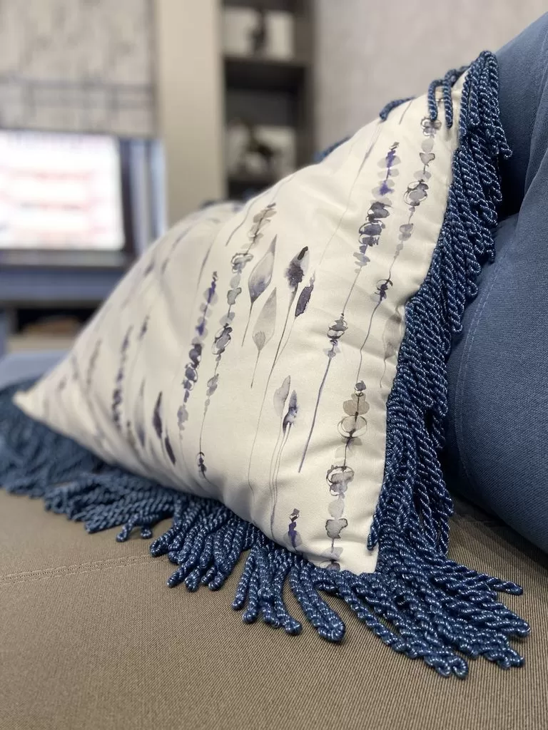 Декоративные подушки с отделкой синим позументом — это элегантный текстильный элемент, который придаст интерьеру выразительность и завершенность. Позумент, выполненный в насыщенном синем цвете, подчеркивает форму подушек и служит утонченным акцентом, особенно эффектно смотрящимся в сочетании с однотонной или контрастной обивкой мебели.