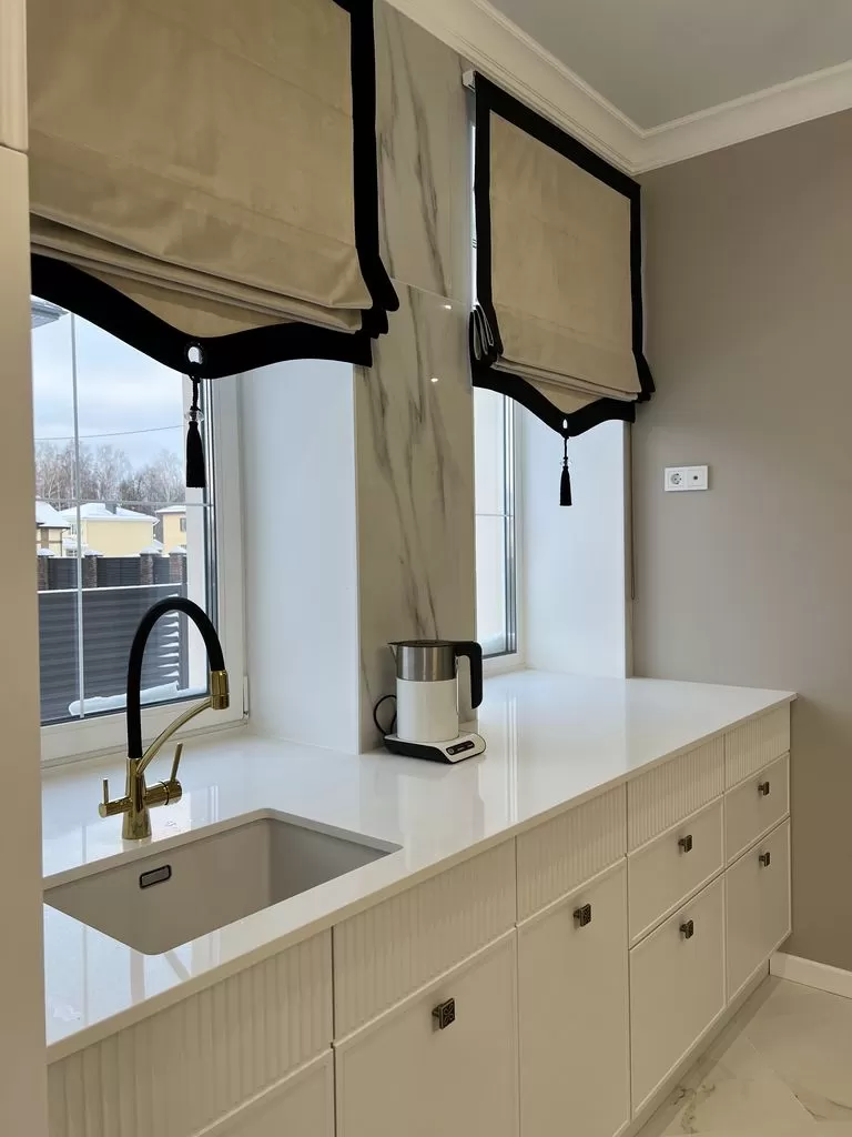 Римская штора с обтачкой не только украшает кухонное окно, но и делает пространство более организованным, светлым и уютным. Отличное решение для тех, кто ценит практичность без ущерба для эстетики.