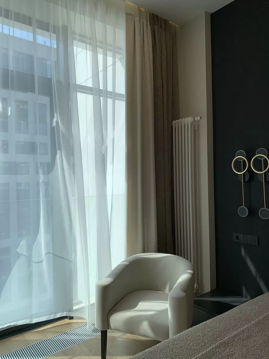 Этот текстильный дуэт создан для спокойных интерьеров, где хочется тишины, уюта и фактурной выразительности. Легкая вуаль мягко пропускает дневной свет, наполняя спальню нежным рассеянным сиянием. Она визуально расширяет пространство и создает атмосферу легкости — идеальный фон для отдыха.