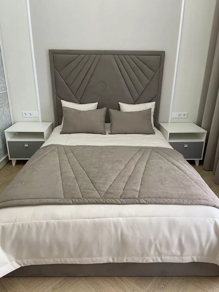 Элегантное покрывало, выполненное в чистом белом цвете, украшено декоративной простеганной дорожкой — утонченной деталью, которая придает композиции глубину и структуру. Идеальный выбор для спальни в современном или классическом стиле, где важны чистые линии и тактильное качество.
